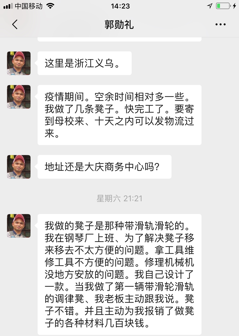 郭勋礼同学自我发明直线滑轨调律凳赠与母校